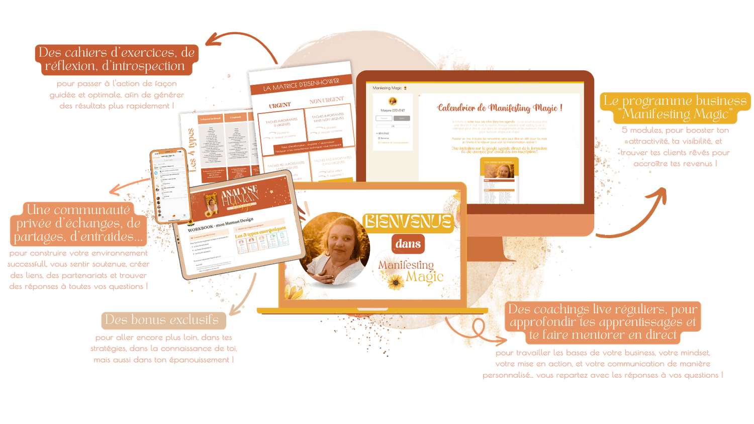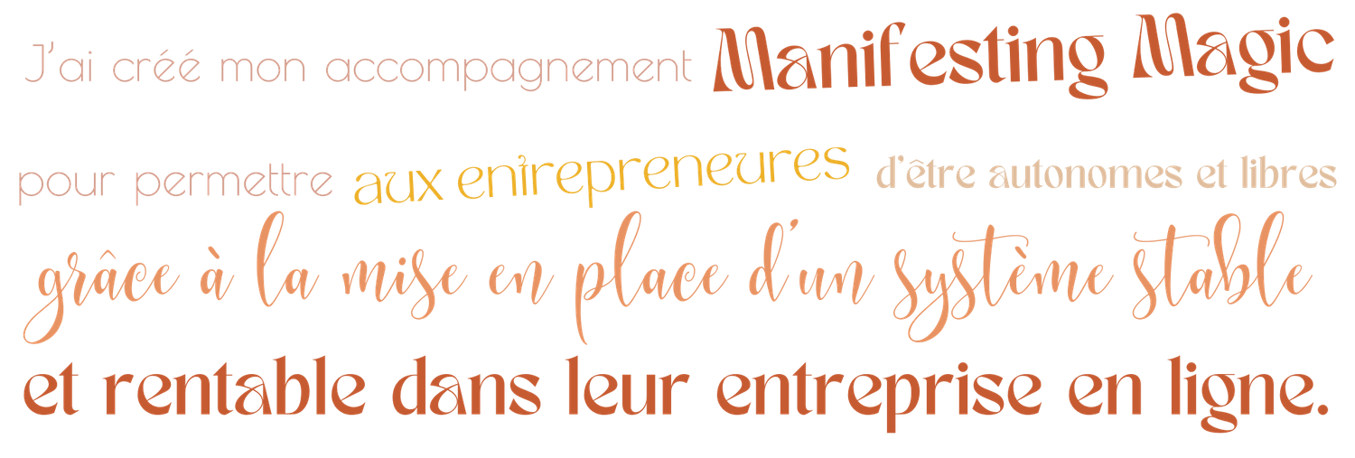 Manifesting Magic, c’est la création d'un business solide et rentable : je vais donc te faire travailler autant les stratégies adaptées à ta personnalité, que ton mindset pour rester une entrepreneure alignée, épanouie et confiante !