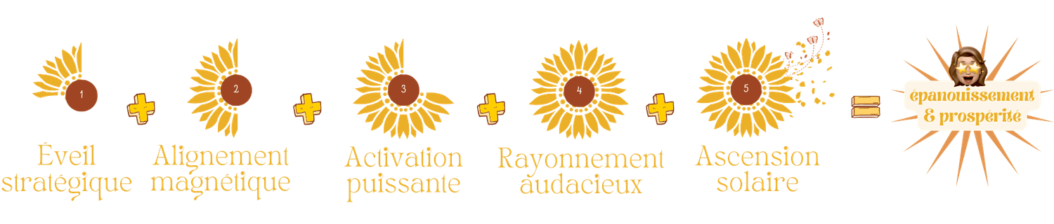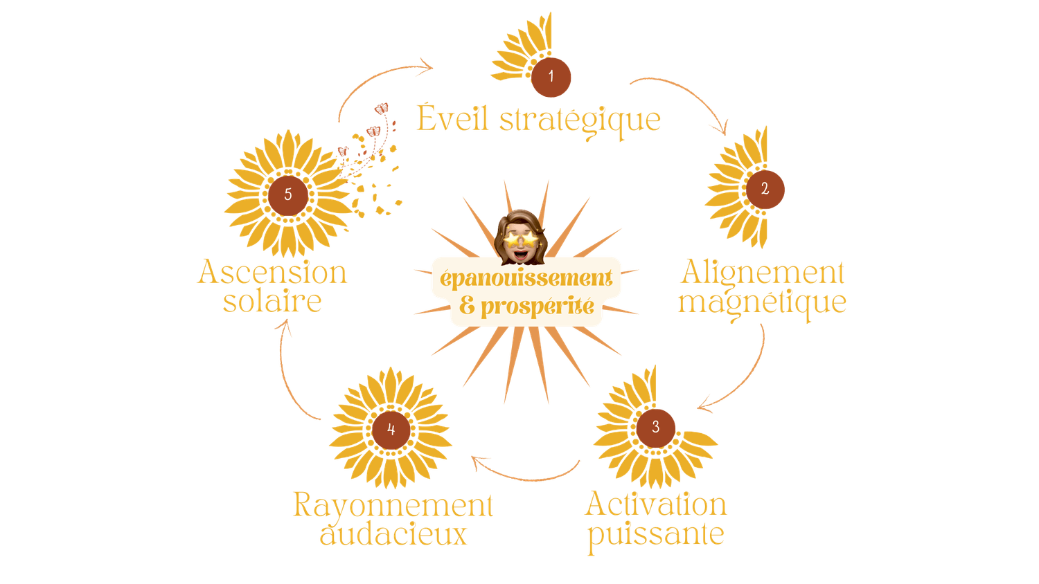 J’ai imaginé un accompagnement en 5 grandes étapes, qui nous guideront à travers les étapes essentielles d’un lancement à succès d’offres en ligne !