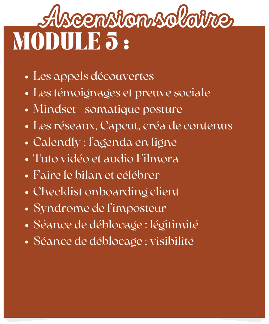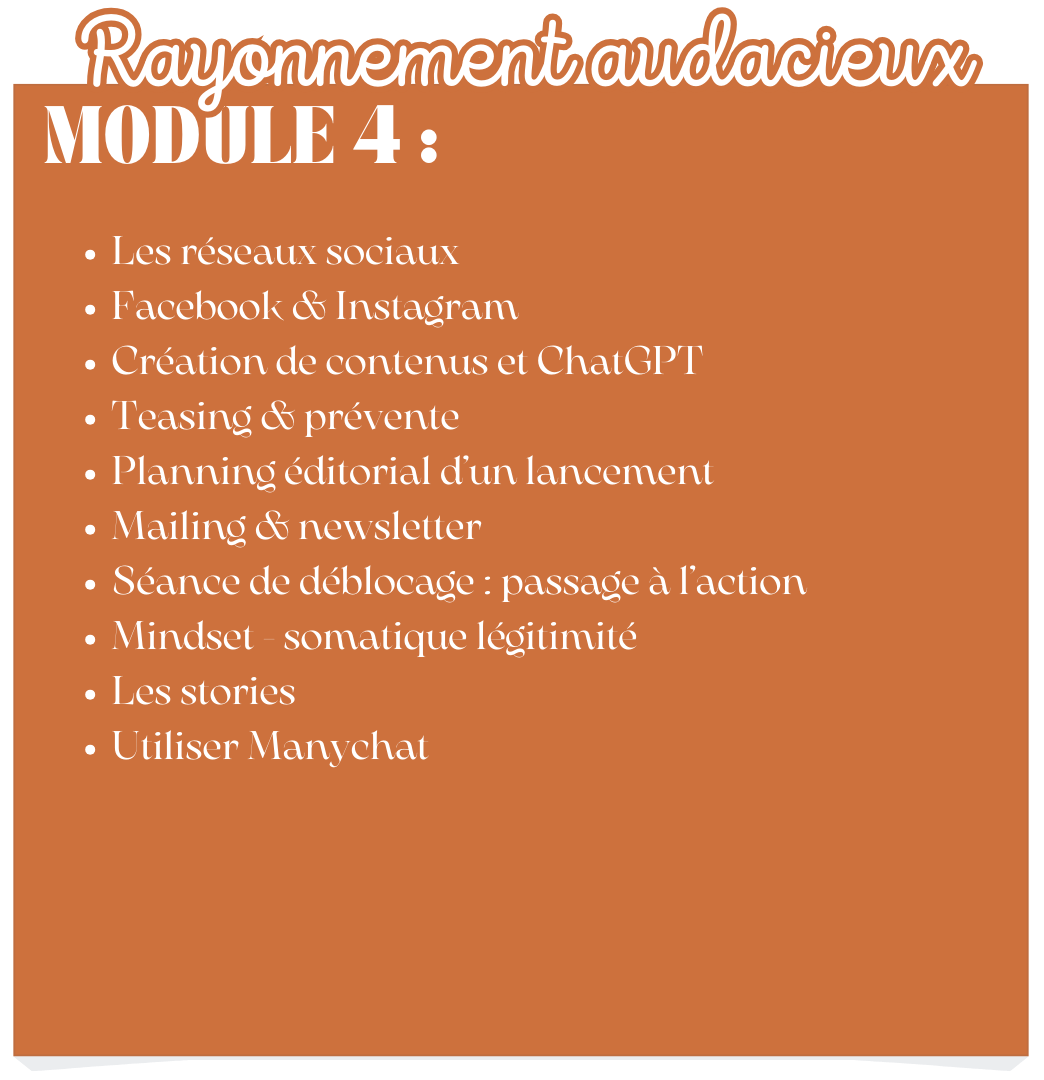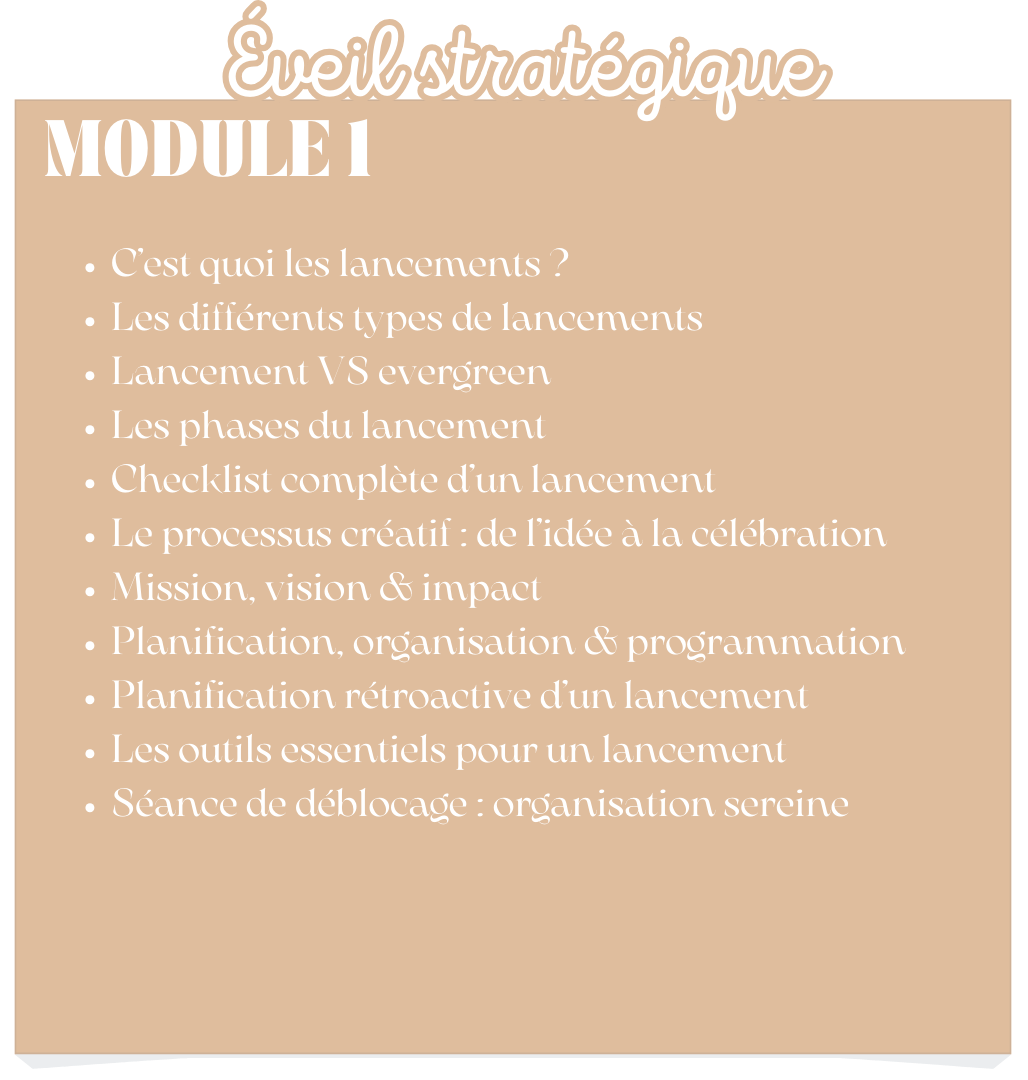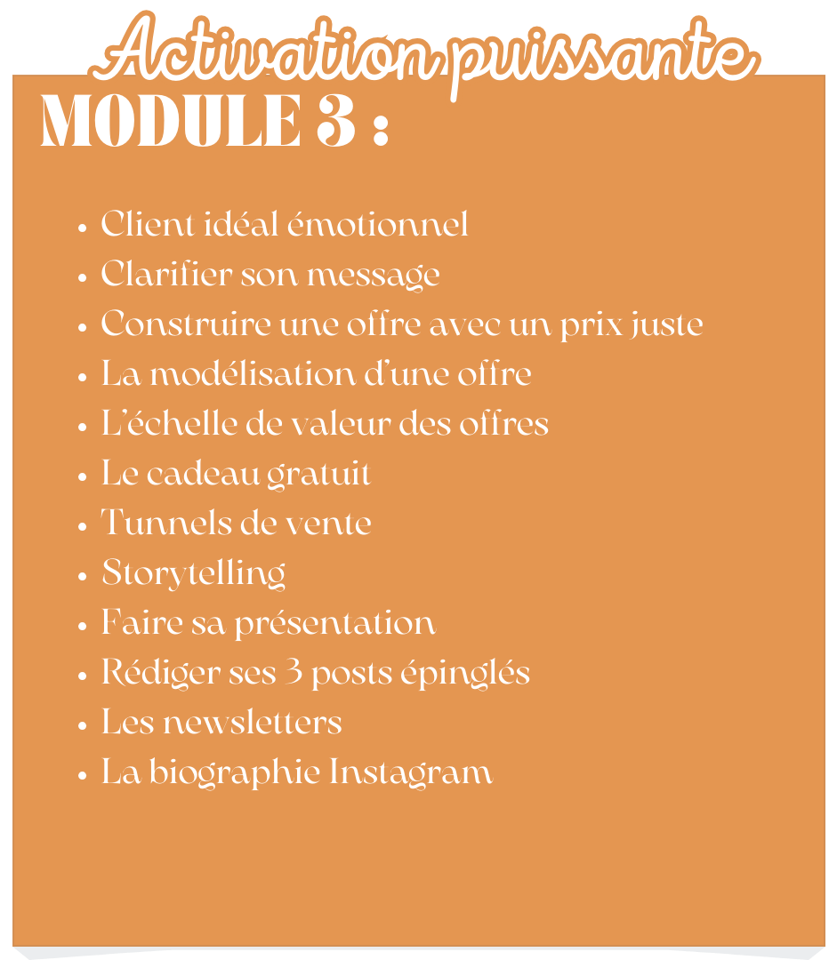 Ces modules t'emmèneront des enseignements clairs, accessibles à tous, ainsi que des travaux pratiques qui reposent sur des tutos ludiques, pour te permettre d’être la créatrice de ton système stable et rentable dans ton entreprise : ta détermination et ta créativité seront tes meilleurs alliés pour arriver à ton objectif d’une abondance de clientes et d’argent !