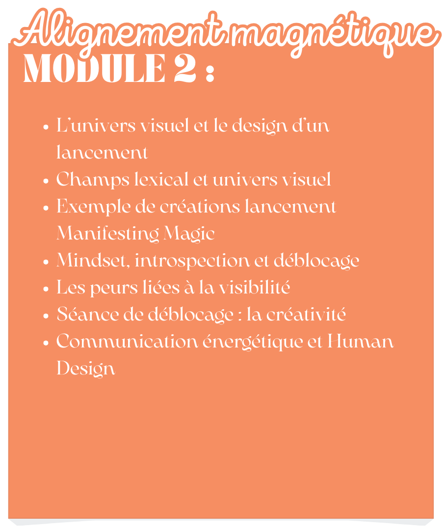 Manifesting Magic, c’est 8 mois pour t'accompagner, t'aider dans ta vie et ton business en allant explorer les stratégies qui te correspondent, et aller à la rencontre de tes blocages inconscients qui t'empêchent de prendre ta place de leader sur les réseaux sociaux, pour créer et animer des lancements qui te ressemblent et qui impactent ta communauté !
