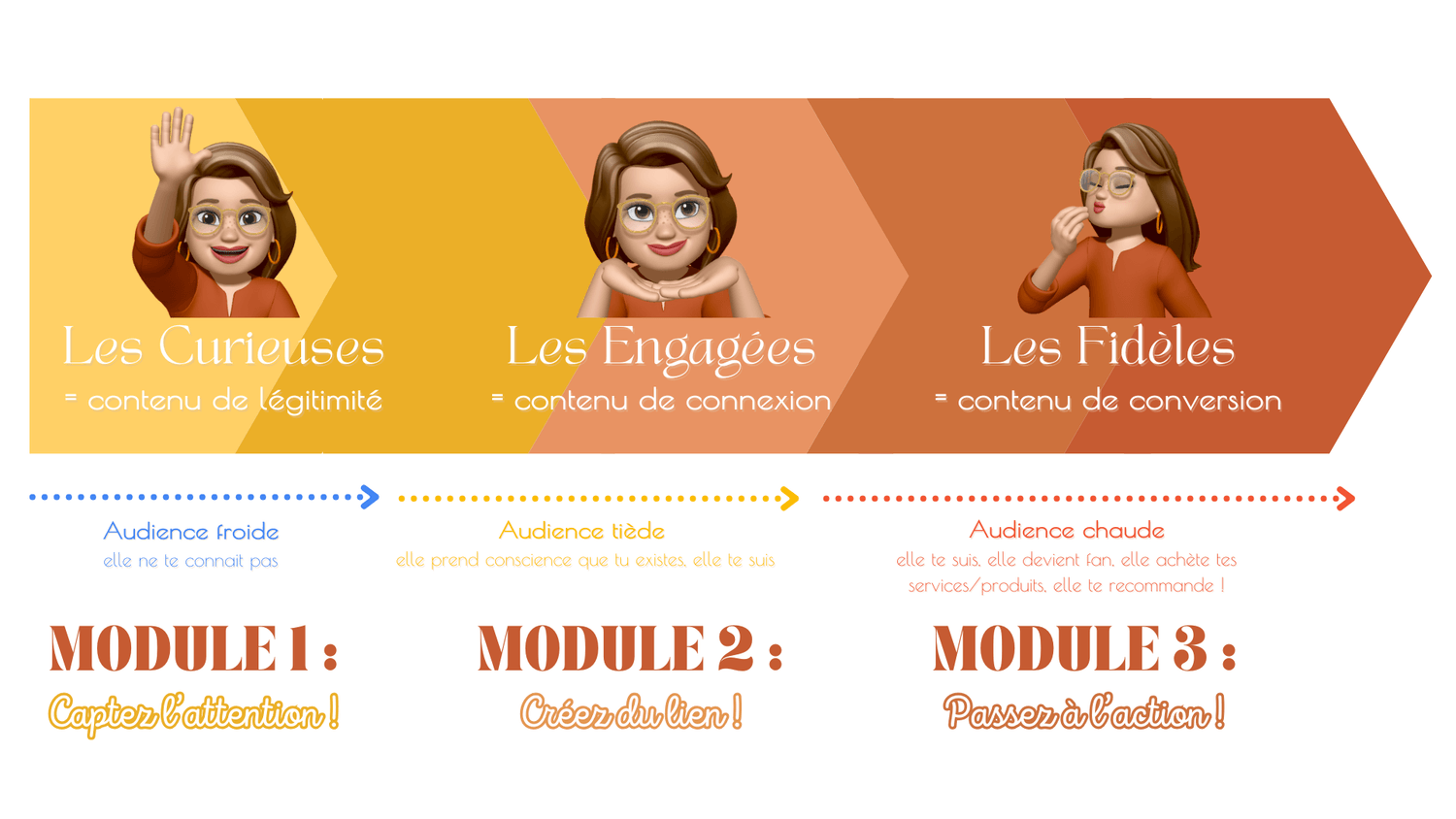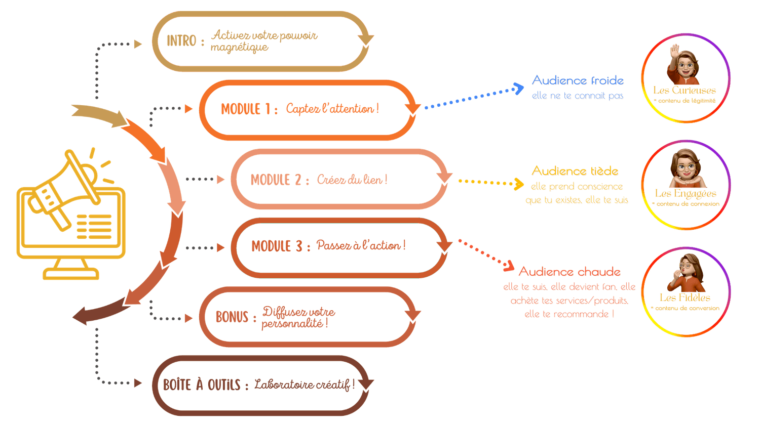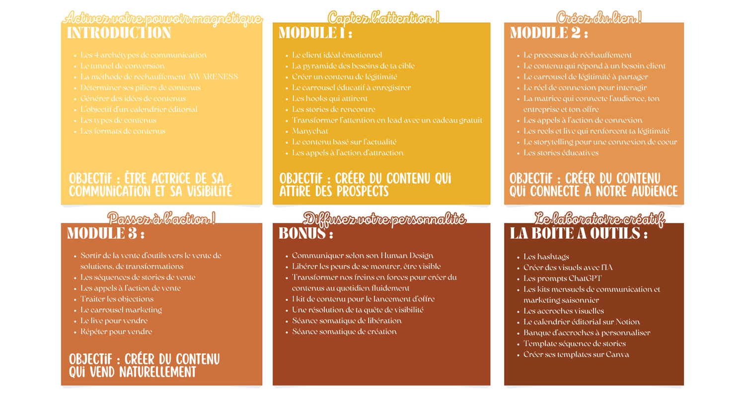 Chaque module est pensé pour transformer ta création de contenu… et ta manière d’être visible. Pas à pas, tu deviens magnétique.